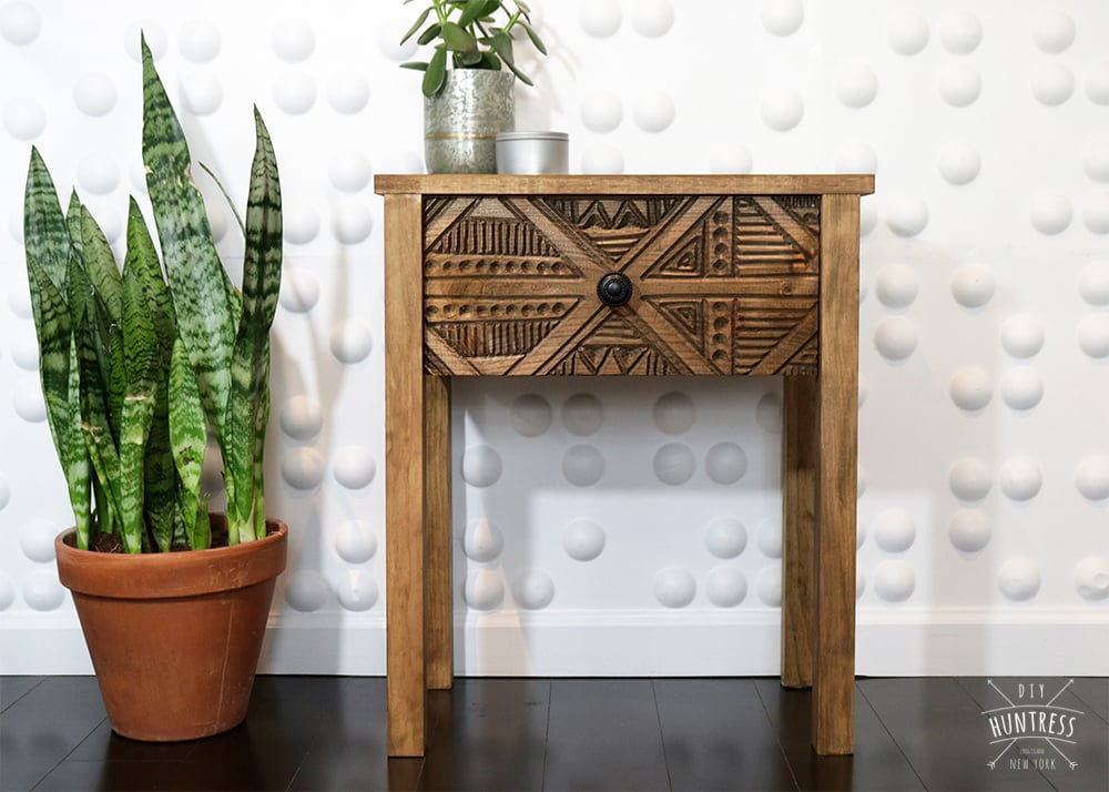 Visit http://diyhuntress.com/2018/06/diy-wood-carved-side-table.html for step-by-step images and information on products and finishing techniques used.